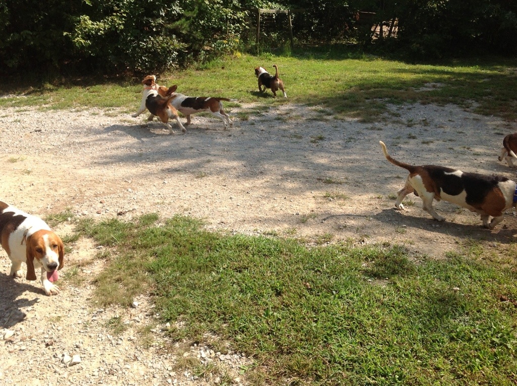 They’ve been fox hunters all their lives and have raised and trained probably hundreds of hunting dogs over the years. Lu started with Bassett hounds in Cecil county, MD, (lots of different breeds: Artesian Normandy, Petite Fauve Griffon, Petite Blue de Gasgone, Westerly, British Bassett, AKC) Dick has taken over the Bassetts and Lu now takes care of the foxhounds. The foxhounds are Penn MaryDels – originally from the Eastern Shore of Maryland where George Washington started the first pack. We’ve hunted the Bassetts the last two mornings. Complete with hunting horns, whips, and pistols (loaded with rat shot if needed to discourage them from tracking deer), they’d start up the hill from the kennel looking for a rabbit scent. One dog would usually start baying, signaling the others that the chase was on. Then 14 other dogs would take off in pursuit. So much fun to watch.