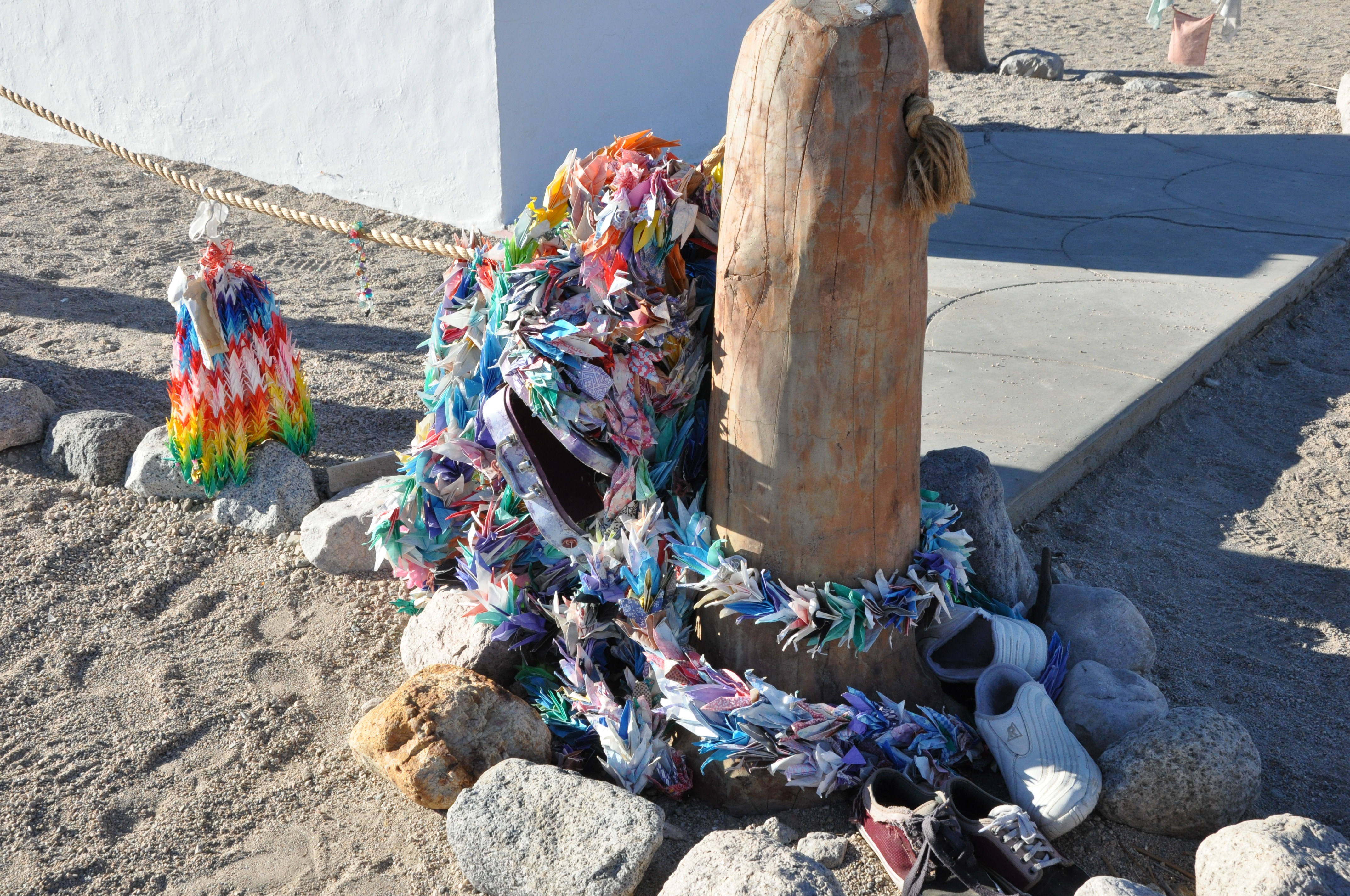 The cemetery shrine’s inscription reads: “Monument to console the souls of the dead.” Ansel Adams also visited Manzanar by invitation while the camp was occupied. One of his famous photos is of this shrine. Survivors and visitors drape strings of origami near the shrine.