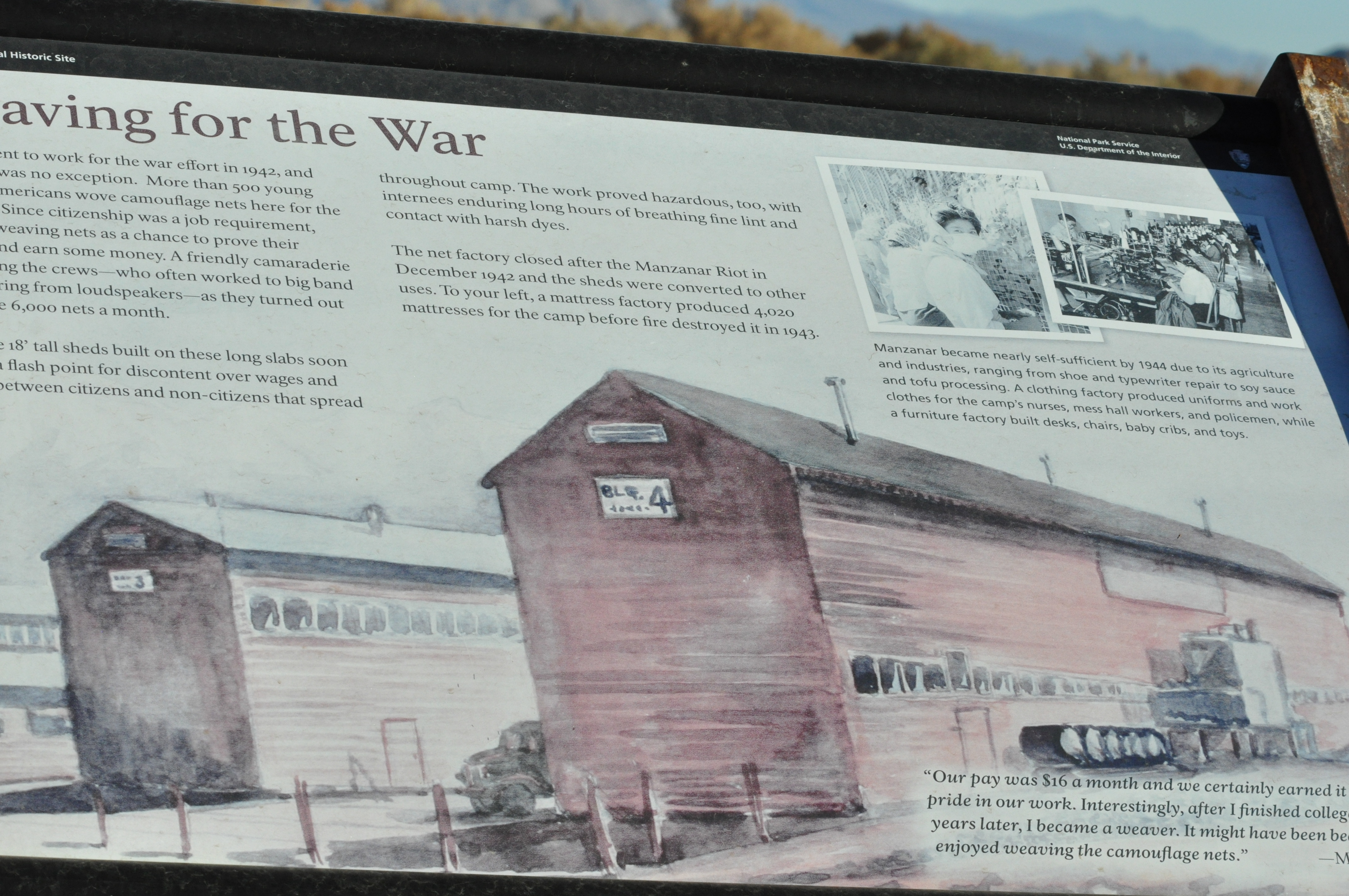 Despite awful conditions (compared to their real homes), the Japanese Americans planted gardens, orchards and erected flowing fountains and pools. They built a nine-hole golf course, and played sports. All able bodied citizens worked at the camp to keep it running and also manufactured camouflage netting for the war effort.