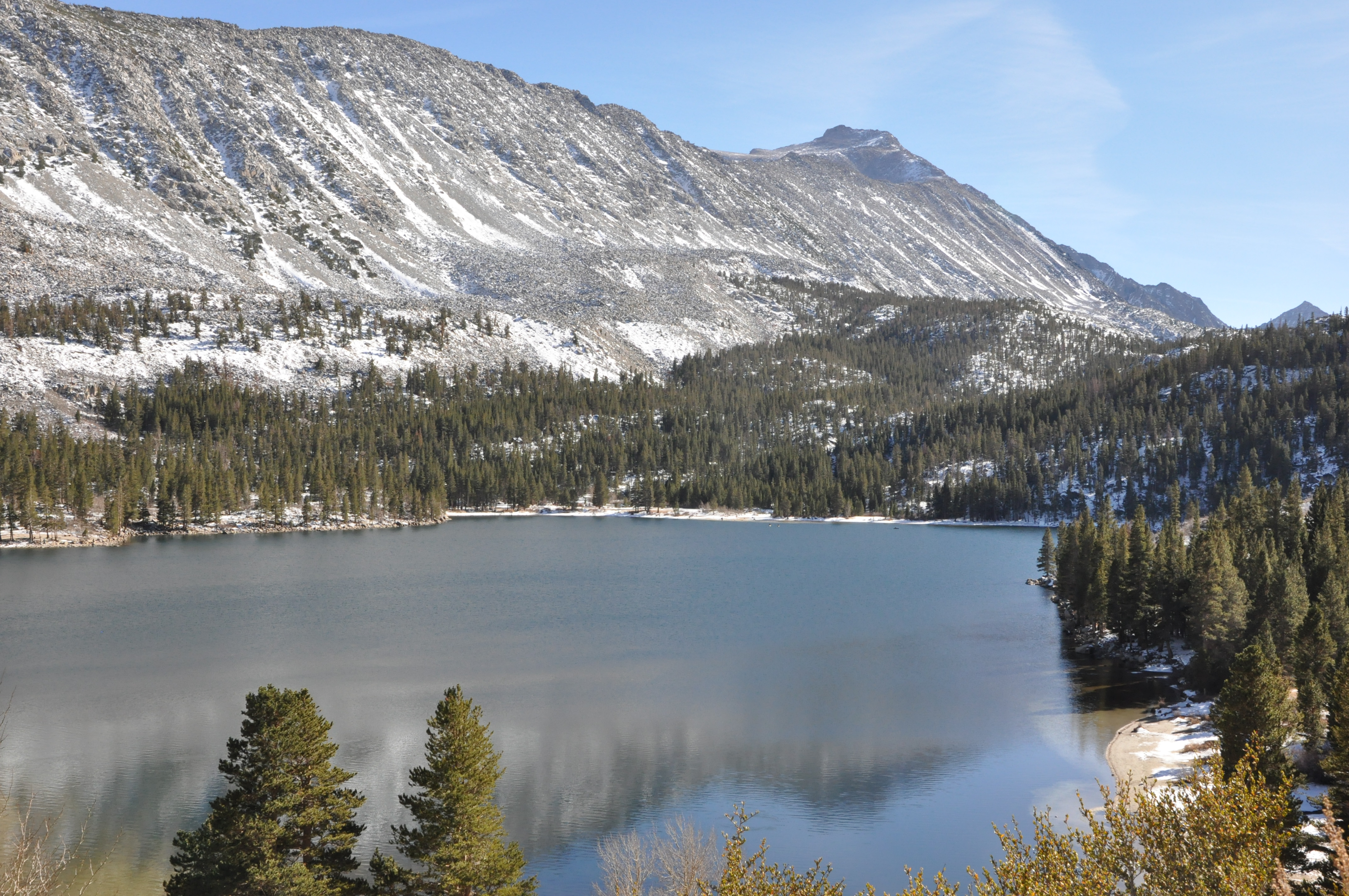 I visited Rock Creek Lake in the Sierras early in November. Since the Owens Valley was warm and Indian Summer-like, I was fooled into wearing sneakers, and light clothing. As Tracker climbed the road (I eventually got up to 10,000’), it became clearer and clearer I was underdressed for the afternoon.