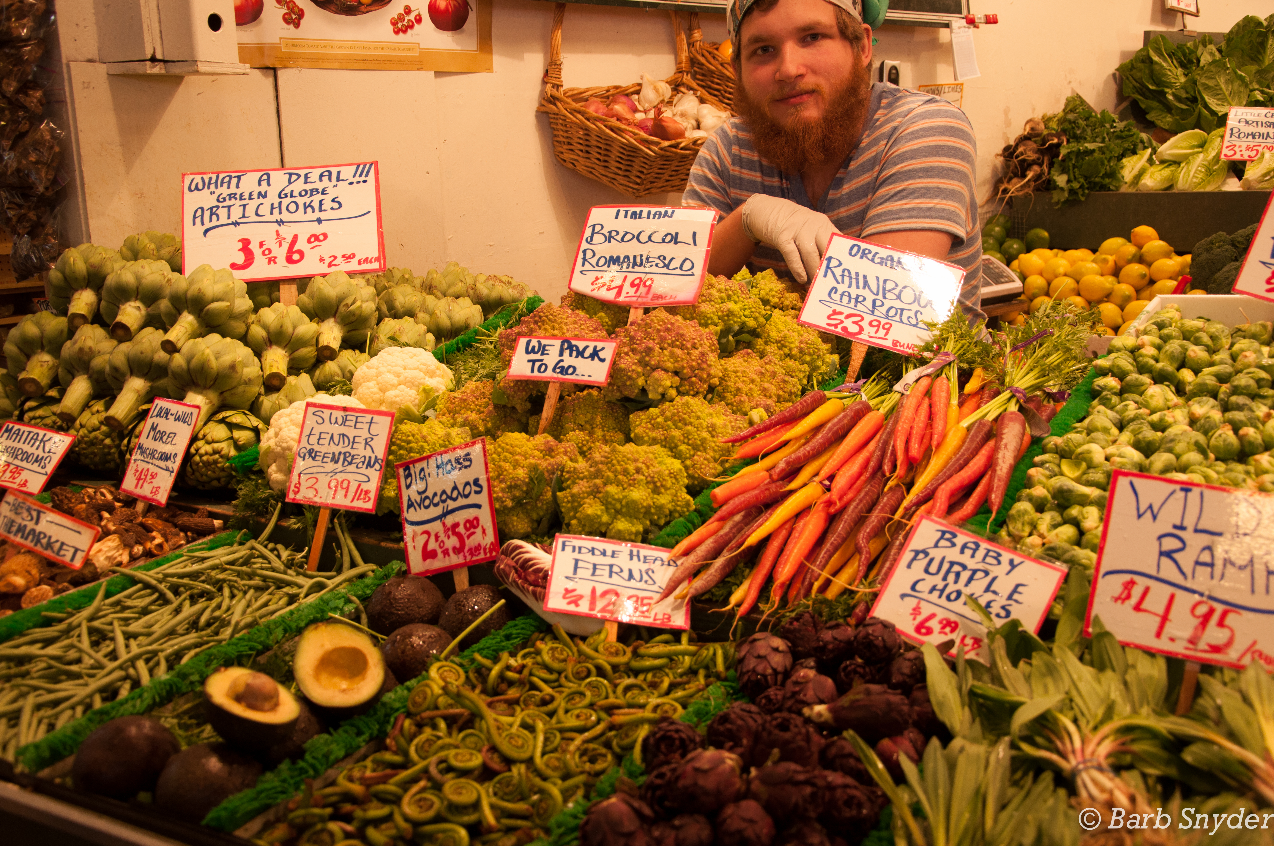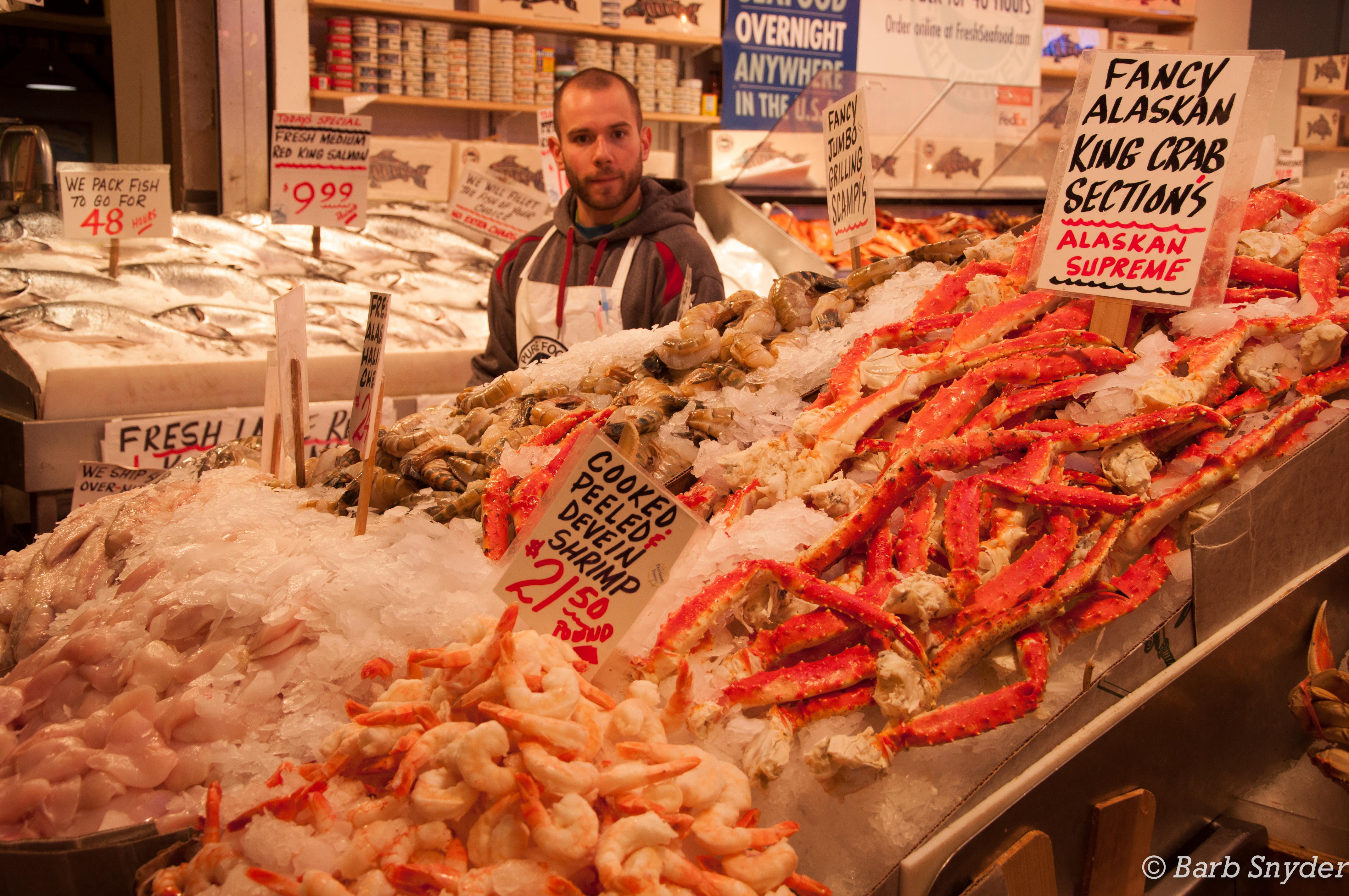In the next photo, look above the girl’s head – there’s a flying fish. The employees of this fish stand are exhibitionists! Many orders are shouted in perfect unison between at least seven male voices, then when someone orders a large fish, they throw the fish through the air to the counter and maybe back again, then back up into the raised counter again. It draws attention!