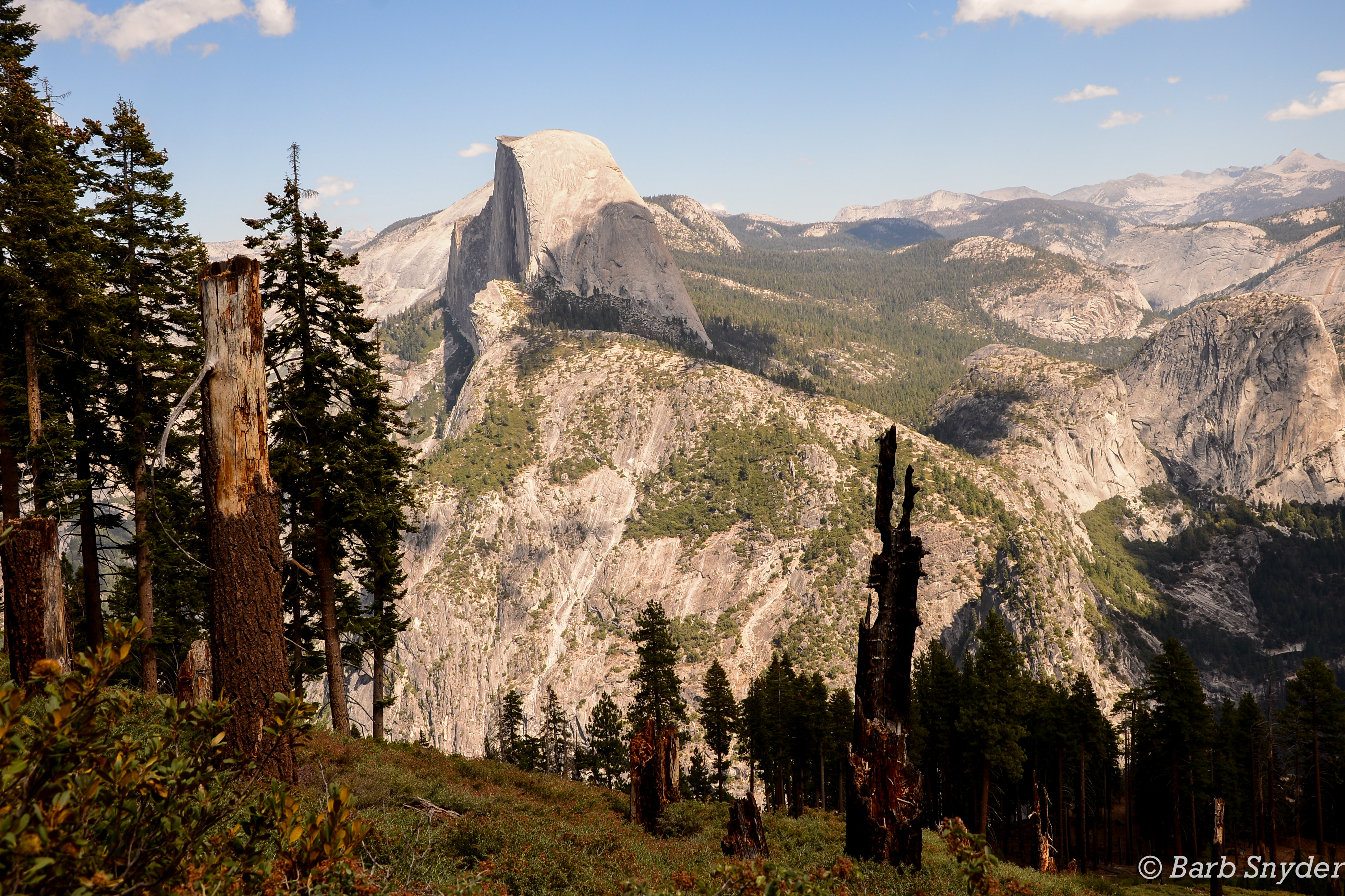 Half Dome with the remains of burnt trees in the foreground. Yosemite is one of the parks that has begun to allow fires to burn through the park. Many pines (and the Sequoias) don’t release their seeds until heat from fires make it happen. The sequoia seeds will only root if they fall on cleared ground (as in ash from a fire). They won’t even sprout if there are leaves, underbrush and pine needles!