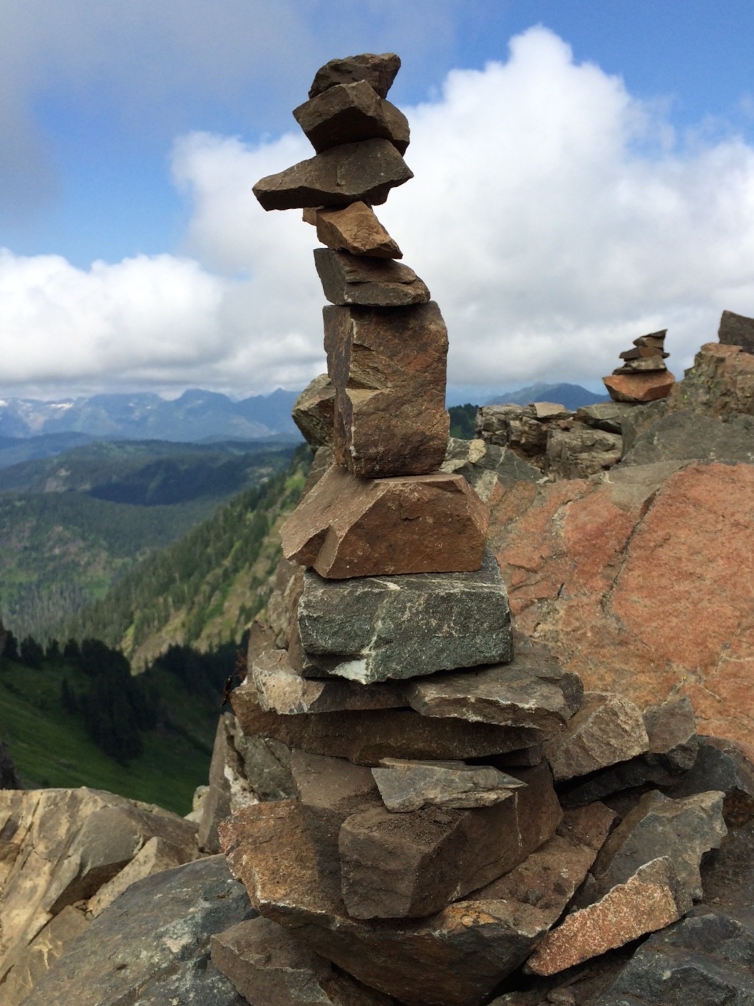 You can see how steep the ascent is.Can you see the people? They really don’t show up on this photo, but we are about halfway up the switchbacks.This was one part of the trail near the top. You can see the clouds closing in.Can you see a little furry creature?He sat long enough to allow several different people to get photos. I believe it is a yellow-bellied marmot.He was whistling his warning sound over and over – he sounds just like a groundhog.The clouds are beginning to break up. Sauk Lake lies to the right of the snow below.When the sun came through the clouds, the mountainsides turned to emeralds.Looking back to where we had lunch, forging on to the top. I probably have 10 photos of this beautiful shot.The last steep ascent, look how high Laurie is placing her right pole – that’s steep.The Sauk River is very gray with minerals and glacier melt. The Skagit (you can almost see it to the left of the evergreens) is blue because the sediment has settled behind a dam further up the river.The view from the top.This cairn was at the top of the mountain we were on, I wonder if the wind toppled it later? There was another slightly higher peak, but this was high enough for me.This butterfly was near the end of its life, a little ragged around the edges. There were so many wildflowers that there were also many bees and butterflies.Yes, there were thistles too.Kevin is way ahead of us, near the end of the trail at the parking lot. Can you see the small speck near the evergreens? Clicking on the photo will bring him a little closer.I debated putting this photo in, but it was part of the day. Hikers told us that it had been there for over a month on the corner of a switchback. I spotted it on the way up and asked Kevin to stop to make sure all was ok.Looking up from the road on the way home through the car window. We were just up there at the top (the peak right in the middle)! A wonderful hike.