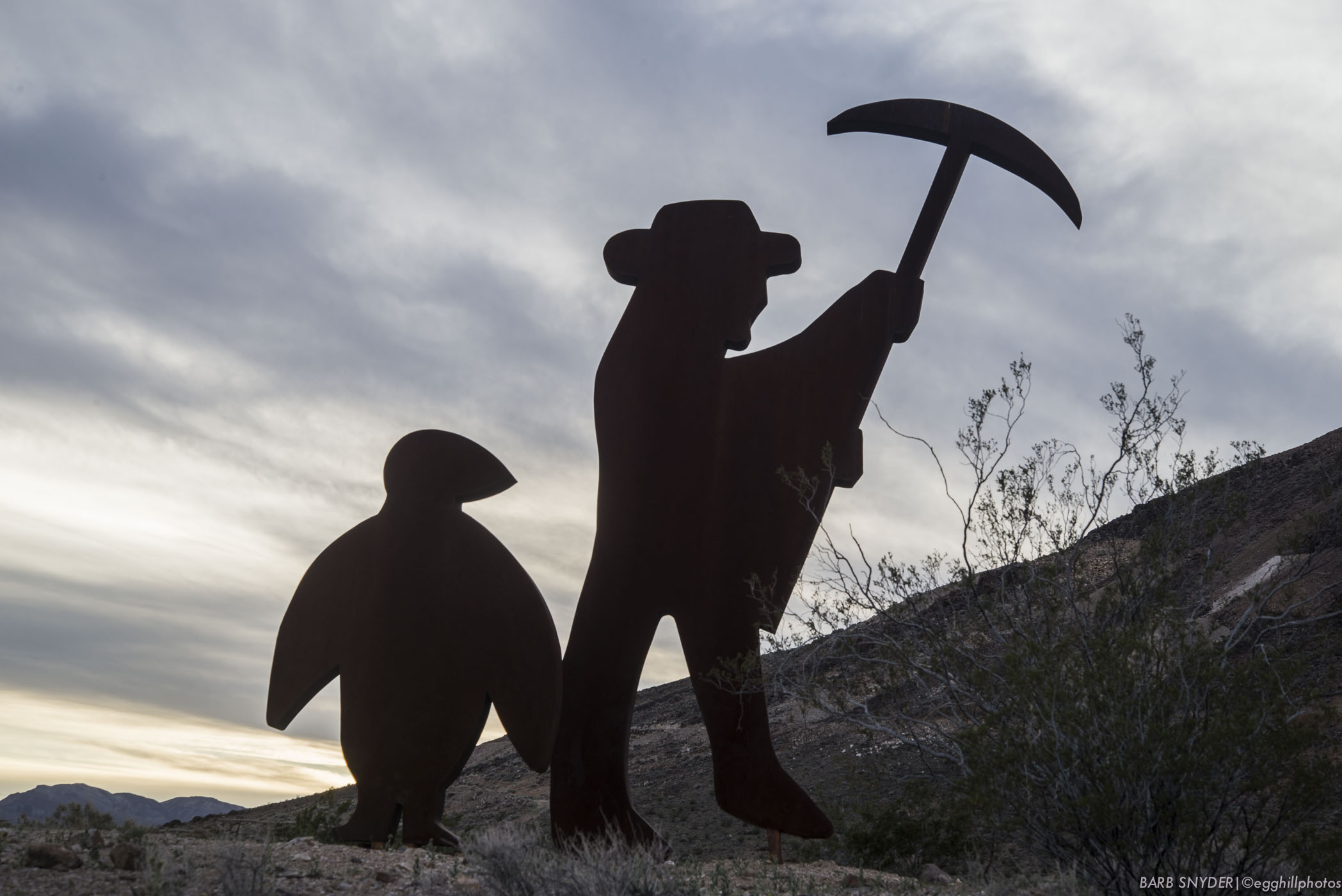 A visit to Rhyolite (part of the National Park Service in Nevada) finished our first day. Rhyolite was a gold mining town that went bust as so many mining towns did. An artist named Szukalski lived in what is now a museum and sculpted some interesting things, a 20′ lego man, a concrete mosaic sofa, a lady on a stake wearing a chastity belt. The miner and what I think looks like a penquin is perpetually striking the mountain.