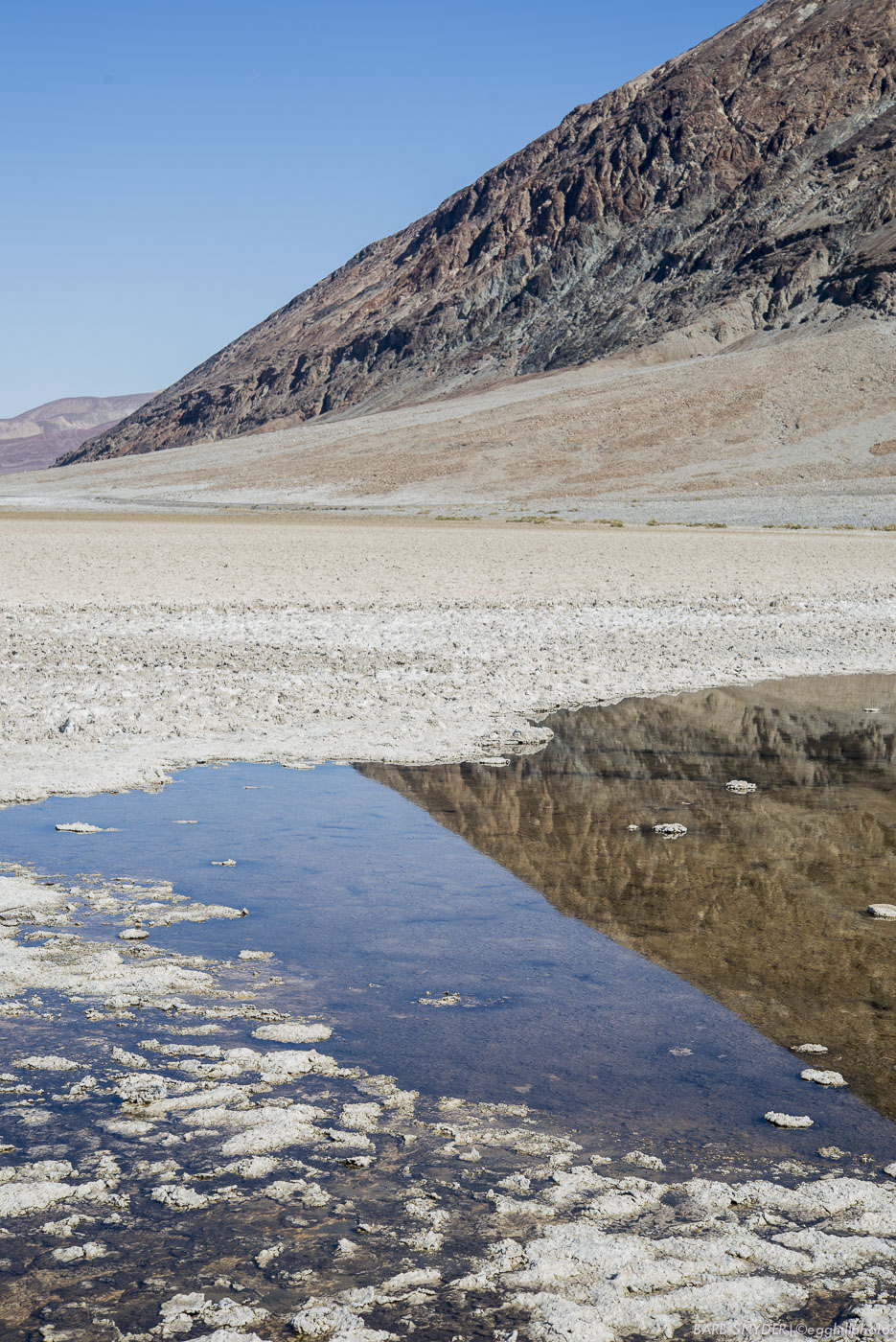 A trip to Death Valley isn’t usually complete without a trip to Badwater at 287′ below sea level (remember, the valley was once part of a sea). When I first drove through Death Valley in 2011, the salt flats all had hexagonal shapes of dried salt (check the picture on the  link to Death Valley National Park). This visit however, was disappointing. It looked like a John Deere tractor (without the tire prints) pulling a huge disc had gone over the entire area. Apparently, torrential rains and subsequent floods had ruined the hexagonal shapes in the salt flats.