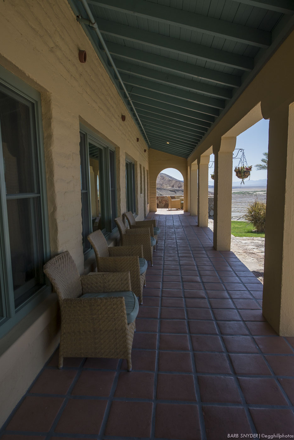 After breakfast in the Forty-Niner Cafe at Furnace Creek Ranch, we visited the more expensive restaurant on the hill: “The Inn at Furnace Creek“. There are palm trees and water at both locations, but the historic Inn was built first in 1927 by the Pacific Coast Borax Company to bring tourists into Death Valley to save the railroad they’d built for the borax mine. The woodwork inside reminded me of many DuPont mansions on the East Coast, in particular, the Pierce-DuPont House in Longwood Gardens.