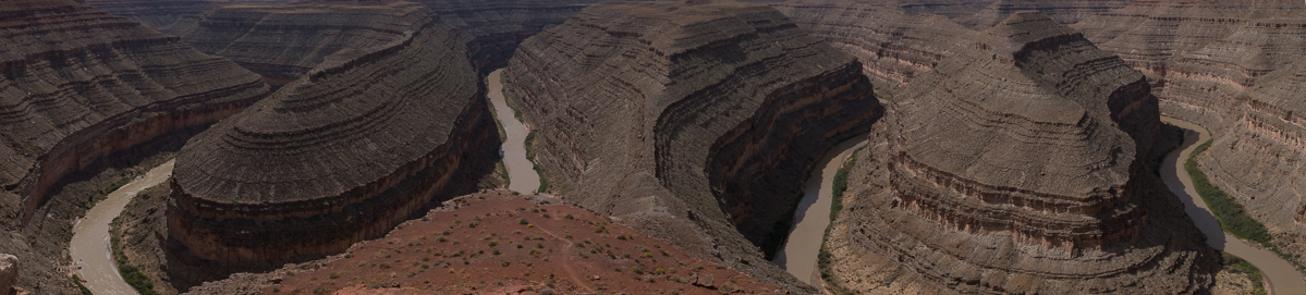 After another sunrise shoot at Monument Valley, we traveled north to Utah. It was mid-day by the time we arrived at Goosenecks State Reserve – the light was kind of flat, but you get the idea. The horizon line was a challenge, but I think this is correct. The reason for the sloped horizon line of the Goosenecks may be that millions of years ago, this part of the Colorado plateau was lifted, leaving the river at the bottom to carve away the sandstone. The ridge in the background is straight though!
